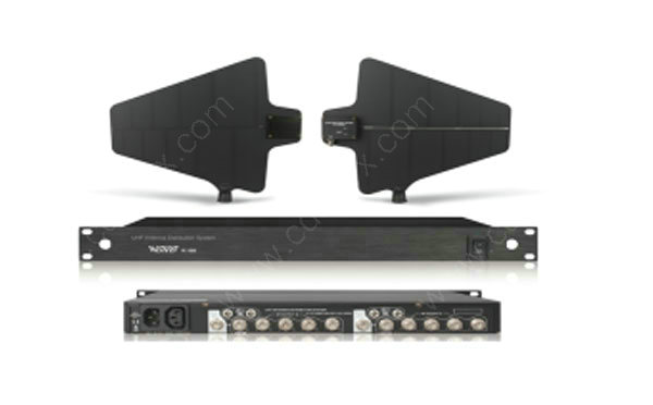 信號分配器工作頻率為450-950MHZ,適用任何品牌分集式接收機,可連接5台接收機,具備串接功能。信號分配器提供4組DC12V/1A電源供接收機用。本係統能穩定接收信號,增強有效距離達300米以上。是演藝擴聲工程必備利器。