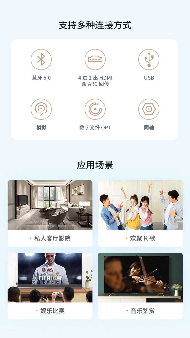 藍牙5.0、USB、4進2出HDMI含ARC回傳、模擬、數字光纖OPT、同軸精致小巧的鋁合金外殼衛星箱