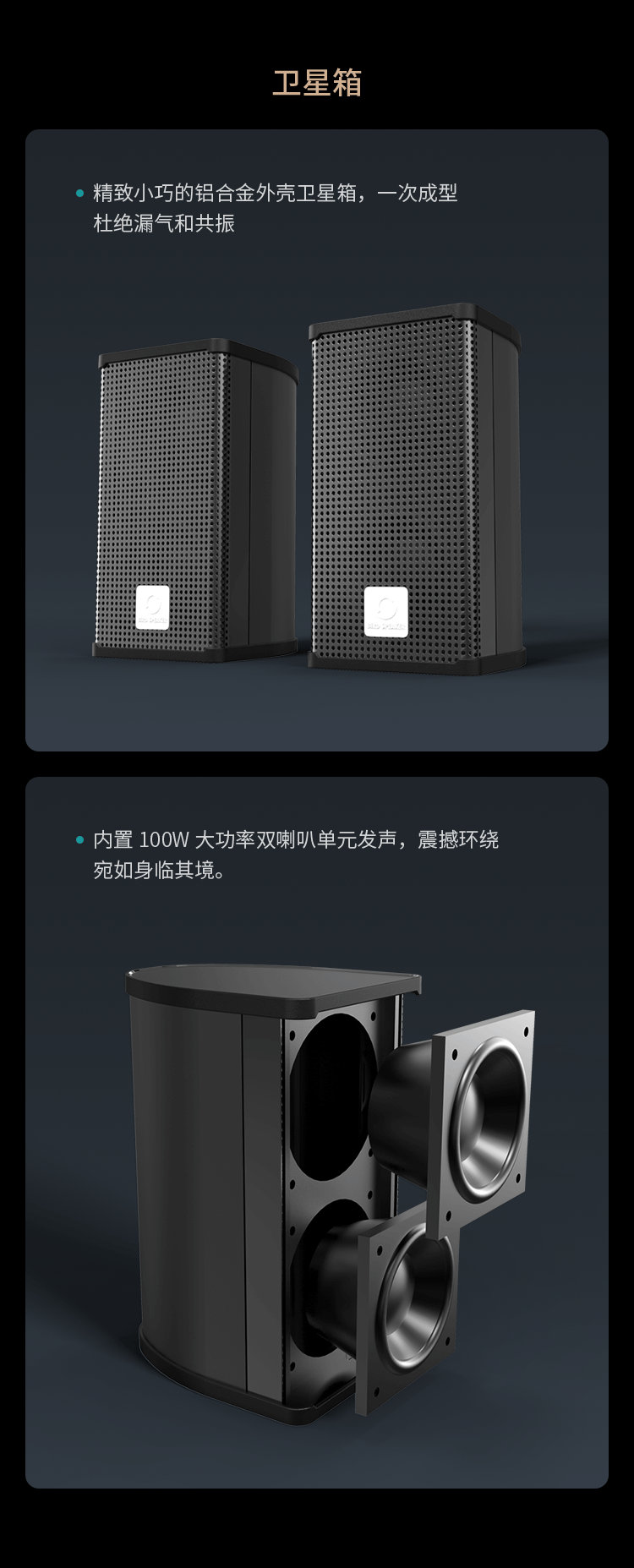 一次成型,杜絕漏氣和共振。內置100W大功率雙喇叭單元發聲,震撼環繞,宛如身臨其境。
